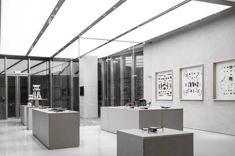 店鋪首層陳列著御 Mavic系列、靈眸 Osmo系列以及機甲大師 RoboMaster等消費級產品,相應的配件和附屬設備一應俱全。店鋪二層則主要陳列如影 Ronin系列、悟 Inspire系列、經緯 Matrices系列等專業級、行業級產品,并另辟空間作為分享會場地,供各類活動使用。